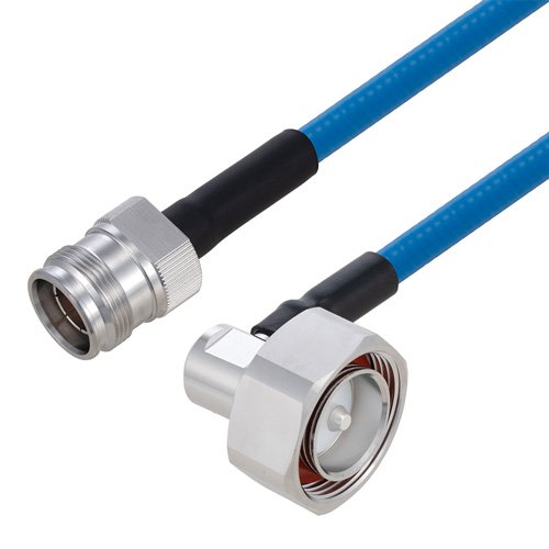 The quarter inch low PIM plenum rated coax used in these 4.3-17 to 7/16 DIN assemblies is a .250 inch diameter copper corrugated coax with a blue FEP jacket. This cable's PTFE dielectric is low loss material with a phase velocity of 76% and offers excellent passive intermodulation (PIM) performance better than -160 dBc. The construction of the quarter inch copper corrugated jumper results in a minimum bend radius of 1.25 inches. The cable assembly's combination of 4.3-17 to 7/16 DIN F/M Right Angle and Times Microwave's SPP-250-LLPL low PIM plenum rated cable supports a maximum operation frequency of 5.8 GHz. Each cable assembly is installed with heat shrink booting on each end and a PIM label with the measured PIM level. You can find detailed performance specifications in the product datasheet. All PolyPhaser assemblies are tested and inspected prior to shipping.