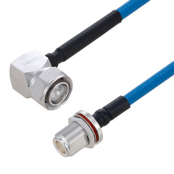 The quarter inch low PIM plenum rated coax used in these 4.3-18 to Type N assemblies is a .250 inch diameter copper corrugated coax with a blue FEP jacket. This cable's PTFE dielectric is low loss material with a phase velocity of 76% and offers excellent passive intermodulation (PIM) performance better than -160 dBc. The construction of the quarter inch copper corrugated jumper results in a minimum bend radius of 1.25 inches. The cable assembly's combination of 4.3-18 to Type N M Right Angle/F Bulkhead and Times Microwave's SPP-250-LLPL low PIM plenum rated cable supports a maximum operation frequency of 5.8 GHz. Each cable assembly is installed with heat shrink booting on each end and a PIM label with the measured PIM level. You can find detailed performance specifications in the product datasheet. All PolyPhaser assemblies are tested and inspected prior to shipping.