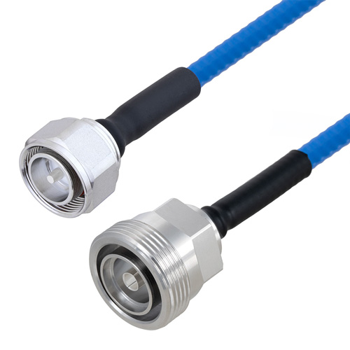 The quarter inch low PIM plenum rated coax used in these 4.3-11 to 7/16 DIN assemblies is a .250 inch diameter copper corrugated coax with a blue FEP jacket. This cable's PTFE dielectric is low loss material with a phase velocity of 76% and offers excellent passive intermodulation (PIM) performance better than -160 dBc. The construction of the quarter inch copper corrugated jumper results in a minimum bend radius of 1.25 inches. The cable assembly's combination of 4.3-11 to 7/16 DIN M/F and Times Microwave's SPP-250-LLPL low PIM plenum rated cable supports a maximum operation frequency of 5.8 GHz. Each cable assembly is installed with heat shrink booting on each end and a PIM label with the measured PIM level. You can find detailed performance specifications in the product datasheet. All PolyPhaser assemblies are tested and inspected prior to shipping.