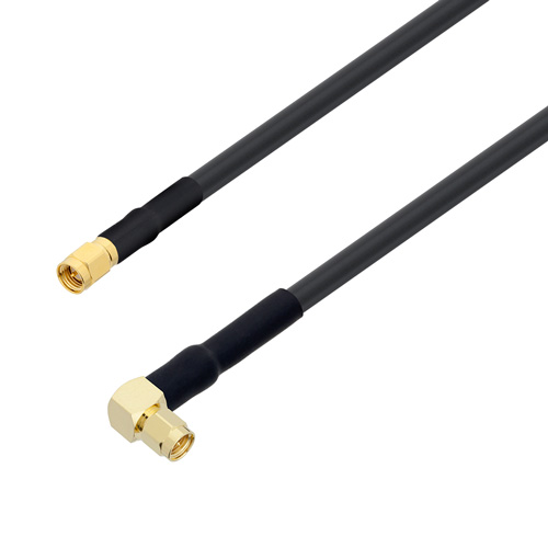 For additional strength, these SMA Male to SMA Male Right Angle cable assemblies have polyolefin heat shrink strain relief boots on both ends of the RF Cable Assembly Jumpers. The heat shrink booting uses a double walled epoxy filled material to prolong the life of the assembly.