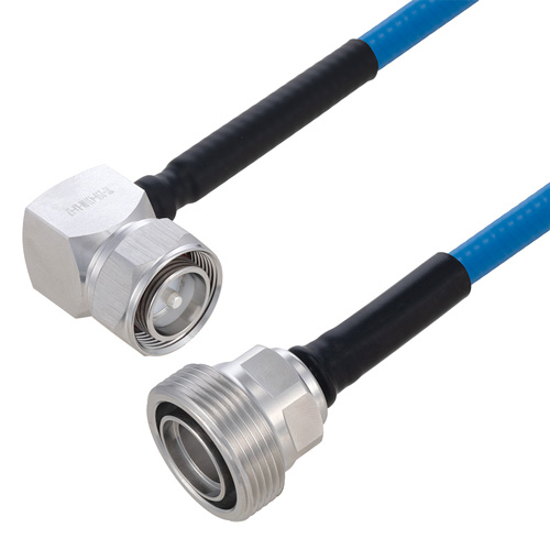 The quarter inch low PIM plenum rated coax used in these 4.3-19 to 7/16 DIN assemblies is a .250 inch diameter copper corrugated coax with a blue FEP jacket. This cable's PTFE dielectric is low loss material with a phase velocity of 76% and offers excellent passive intermodulation (PIM) performance better than -160 dBc. The construction of the quarter inch copper corrugated jumper results in a minimum bend radius of 1.25 inches. The cable assembly's combination of 4.3-19 to 7/16 DIN M Right Angle/F and Times Microwave's SPP-250-LLPL low PIM plenum rated cable supports a maximum operation frequency of 5.8 GHz. Each cable assembly is installed with heat shrink booting on each end and a PIM label with the measured PIM level. You can find detailed performance specifications in the product datasheet. All PolyPhaser assemblies are tested and inspected prior to shipping.