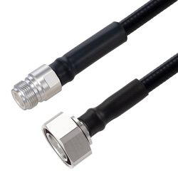 The three eighths inch low PIM outdoor rated coax used in these Type N to 7/16 DIN assemblies is a .375 inch diameter copper corrugated coax with a black FRPE jacket. This cable's foam PE dielectric is low loss material with a phase velocity of 83% and offers excellent passive intermodulation (PIM) performance better than -160 dBc. The construction of the three eighths inch copper corrugated jumper results in a minimum bend radius of 1.25 inches. The cable assembly's combination of Type N to 7/16 DIN F/M and Times Microwave's SPO-381 low PIM plenum rated cable supports a maximum operation frequency of 5.8 GHz. Each cable assembly is installed with heat shrink booting on each end and a PIM label with the measured PIM level. You can find detailed performance specifications in the product datasheet. All PolyPhaser assemblies are tested and inspected prior to shipping.