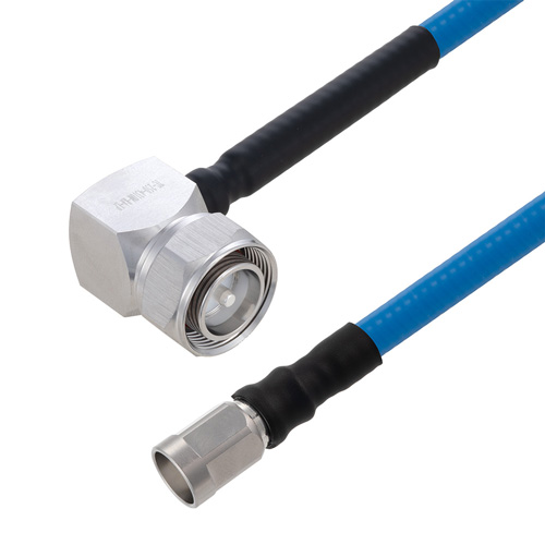 The quarter inch low PIM plenum rated coax used in these 4.3-16 to NEX16 assemblies is a .250 inch diameter copper corrugated coax with a blue FEP jacket. This cable's PTFE dielectric is low loss material with a phase velocity of 76% and offers excellent passive intermodulation (PIM) performance better than -160 dBc. The construction of the quarter inch copper corrugated jumper results in a minimum bend radius of 1.25 inches. The cable assembly's combination of 4.3-16 to NEX16 M Right Angle/M and Times Microwave's SPP-250-LLPL low PIM plenum rated cable supports a maximum operation frequency of 5.8 GHz. Each cable assembly is installed with heat shrink booting on each end and a PIM label with the measured PIM level. You can find detailed performance specifications in the product datasheet. All PolyPhaser assemblies are tested and inspected prior to shipping.