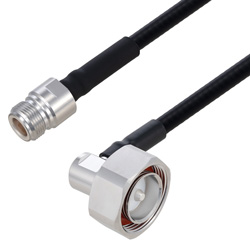 The quarter inch low PIM outdoor rated coax used in these Type N to 7/16 DIN assemblies is a .250 inch diameter copper corrugated coax with a black PE jacket. This cable's foam PE dielectric is low loss material with a phase velocity of 83% and offers excellent passive intermodulation (PIM) performance better than -160 dBc. The construction of the quarter inch copper corrugated jumper results in a minimum bend radius of 1.25 inches. The cable assembly's combination of Type N to 7/16 DIN F/M Right Angle and Times Microwave's SPO-253 low PIM plenum rated cable supports a maximum operation frequency of 5.8 GHz. Each cable assembly is installed with heat shrink booting on each end and a PIM label with the measured PIM level. You can find detailed performance specifications in the product datasheet. All PolyPhaser assemblies are tested and inspected prior to shipping.