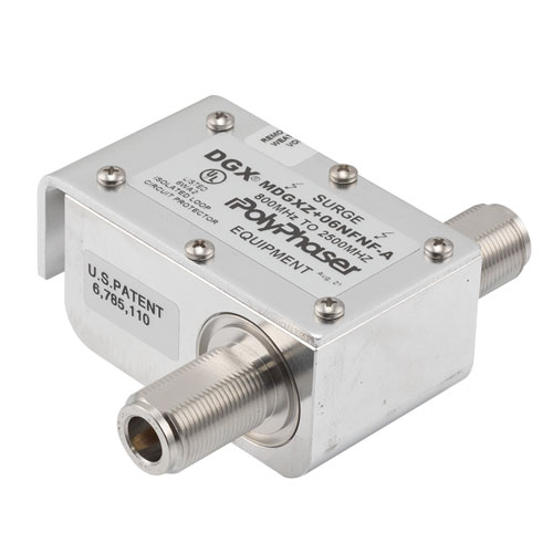PolyPhaser coaxial RF surge protector (also known as lightning surge protector, lightning surge arrestor or suppressor) MDGXZ+06NFNF-A is in-stock and will ship same-day as purchased. This radio frequency surge protector / lightning surge arrestor helps protect your equipment from electromagnetic pulse (EMP) or power surges that are commonly caused by lightning or other strong electrical changes. Our radio frequency coaxial surge protector product is commonly used for radio and antenna installations where part or all system equipment is outdoors to protect sensitive equipment and is designed to pass 800 MHz to 2.5 GHz while suppressing DC surge.