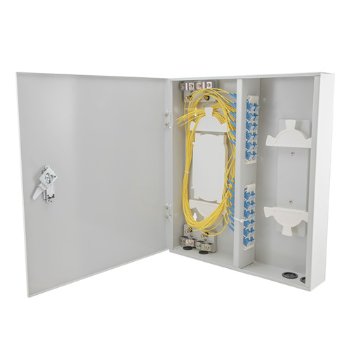 Wall Mount Fiber Enclosure, Single Mode SC/UPC, 24 Coupler Ports and Pigtails, SPCC Steel, Gray