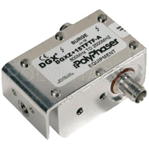 PolyPhaser coaxial RF surge protector (also known as lightning surge protector, lightning surge arrestor or suppressor) DGXZ+15TFTF-A is in-stock and will ship same-day as purchased. This radio frequency surge protector / lightning surge arrestor helps protect your equipment from electromagnetic pulse (EMP) or power surges that are commonly caused by lightning or other strong electrical changes. Our radio frequency coaxial surge protector product is commonly used for radio and antenna installations where part or all system equipment is outdoors to protect sensitive equipment and is designed to pass 800 MHz to 2.5 GHz while suppressing DC surge.