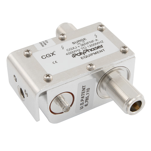 PolyPhaser coaxial RF surge protector (also known as lightning surge protector, lightning surge arrestor or suppressor) CGXJ+36NFNF-A is in-stock and will ship same-day as purchased. This radio frequency surge protector / lightning surge arrestor helps protect your equipment from electromagnetic pulse (EMP) or power surges that are commonly caused by lightning or other strong electrical changes. Our radio frequency coaxial surge protector product is commonly used for radio and antenna installations where part or all system equipment is outdoors to protect sensitive equipment and is designed to pass 400 MHz to 1.2 GHz while suppressing DC surge.