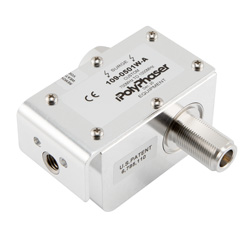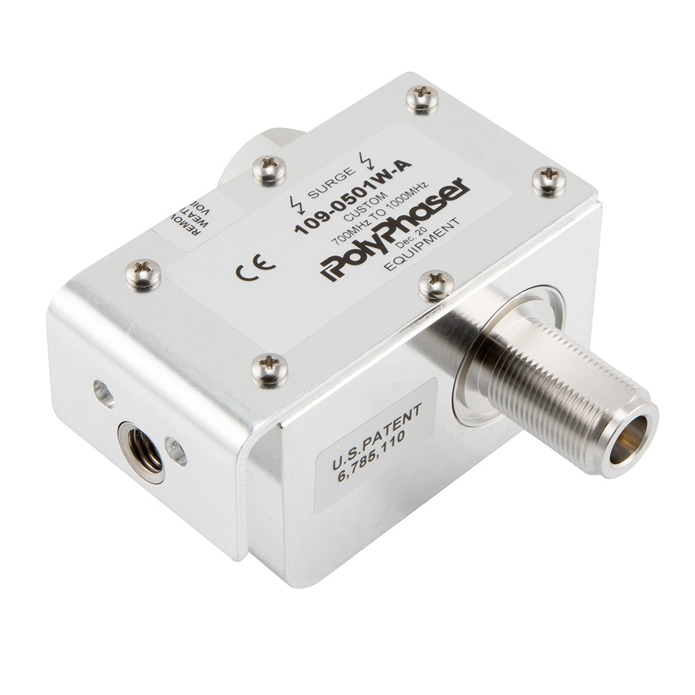 PolyPhaser coaxial RF surge protector (also known as lightning surge protector, lightning surge arrestor or suppressor) 109-0501W-A is in-stock and will ship same-day as purchased. This radio frequency surge protector / lightning surge arrestor helps protect your equipment from electromagnetic pulse (EMP) or power surges that are commonly caused by lightning or other strong electrical changes. Our radio frequency coaxial surge protector product is commonly used for radio and antenna installations where part or all system equipment is outdoors to protect sensitive equipment and is designed to pass 700 MHz to 1 GHz while suppressing DC surge.