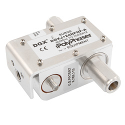 PolyPhaser coaxial RF surge protector (also known as lightning surge protector, lightning surge arrestor or suppressor) DGXJ+24NFNF-A is in-stock and will ship same-day as purchased. This radio frequency surge protector / lightning surge arrestor helps protect your equipment from electromagnetic pulse (EMP) or power surges that are commonly caused by lightning or other strong electrical changes. Our radio frequency coaxial surge protector product is commonly used for radio and antenna installations where part or all system equipment is outdoors to protect sensitive equipment and is designed to pass 800 MHz to 2.5 GHz while suppressing DC surge.