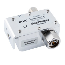 PolyPhaser coaxial RF surge protector (also known as lightning surge protector, lightning surge arrestor or suppressor) DGXZ+15NFNM-A is in-stock and will ship same-day as purchased. This radio frequency surge protector / lightning surge arrestor helps protect your equipment from electromagnetic pulse (EMP) or power surges that are commonly caused by lightning or other strong electrical changes. Our radio frequency coaxial surge protector product is commonly used for radio and antenna installations where part or all system equipment is outdoors to protect sensitive equipment and is designed to pass 800 MHz to 2.5 GHz while suppressing DC surge.