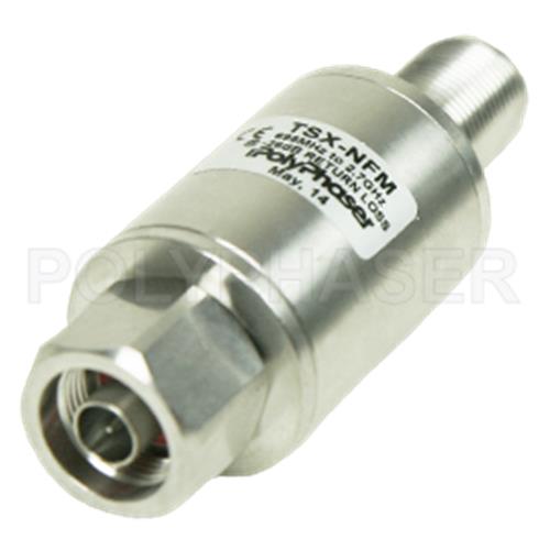 PolyPhaser coaxial RF surge protector (also known as lightning surge protector, lightning surge arrestor or suppressor) TSX-NFM-BF is in-stock and will ship same-day as purchased. This radio frequency surge protector / lightning surge arrestor helps protect your equipment from electromagnetic pulse (EMP) or power surges that are commonly caused by lightning or other strong electrical changes. Our radio frequency coaxial surge protector product is commonly used for radio and antenna installations where part or all system equipment is outdoors to protect sensitive equipment and is designed to pass 698 MHz to 2.7 GHz while suppressing DC surge.