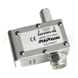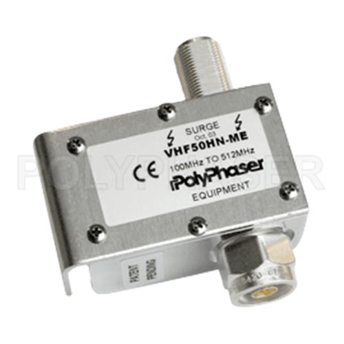 PolyPhaser coaxial RF surge protector (also known as lightning surge protector, lightning surge arrestor or suppressor) VHF50HN-ME is in-stock and will ship same-day as purchased. This radio frequency surge protector / lightning surge arrestor helps protect your equipment from electromagnetic pulse (EMP) or power surges that are commonly caused by lightning or other strong electrical changes. Our radio frequency coaxial surge protector product is commonly used for radio and antenna installations where part or all system equipment is outdoors to protect sensitive equipment and is designed to pass 100 MHz to 512 MHz while suppressing DC surge.