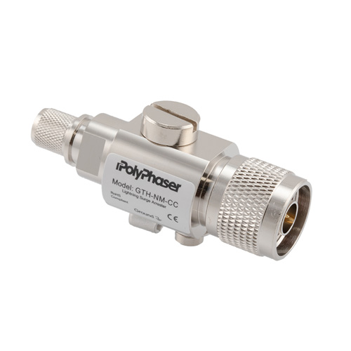 PolyPhaser coaxial RF surge protector (also known as lightning surge protector, lightning surge arrestor or suppressor) GTH-NM-CC is in-stock and will ship same-day as purchased. This radio frequency surge protector / lightning surge arrestor helps protect your equipment from electromagnetic pulse (EMP) or power surges that are commonly caused by lightning or other strong electrical changes. Our radio frequency coaxial surge protector product is commonly used for radio and antenna installations where part or all system equipment is outdoors to protect sensitive equipment and is designed to pass DC to 5.8 GHz while suppressing DC surge.